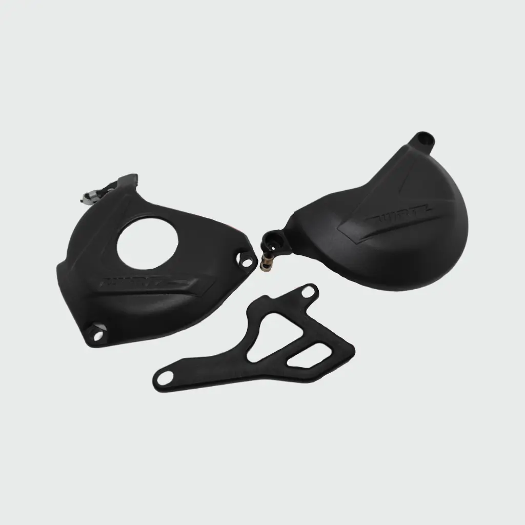 Función: Protección contra Golpes y Rayaduras: Protegen las tapas de motor de fábrica (que generalmente son de magnesio o aluminio y se dañan fácilmente) de golpes directos, abrasión en caso de caída lateral y ralladuras.